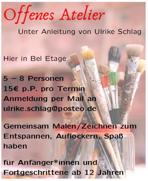 Ab März 2023 findet einmal im Monat ein offenes Atelier statt. Das bedeutet, jeder ist willkommen (mit Voranmeldung). Wir arbeiten jeder für sich in einer Kleingruppe und ganz gemäß den eigenen Bedürfnissen. Ausprobieren und Experimentieren ist ausdrücklich erwünscht.