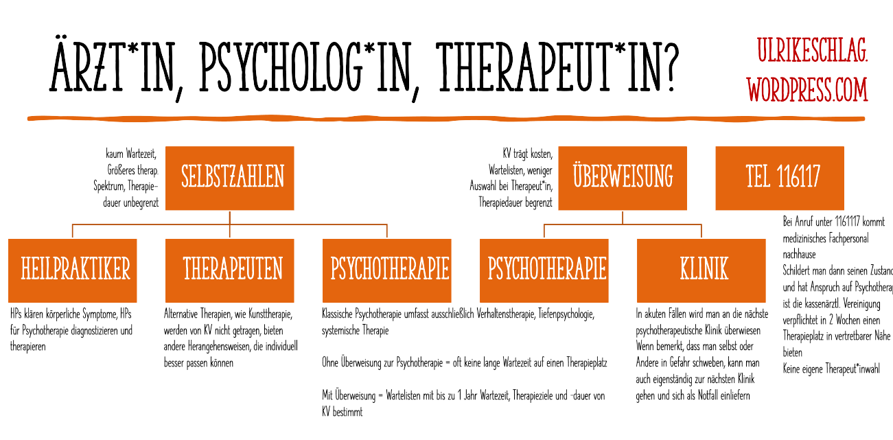 Nach dem Lesen des vorigen Blogeintrages bist du ja nun voll motiviert deine psychischen und emotionalen Probleme anzupacken. Aber wohin geht man damit? Klinik? Hausärzt*in? Beratungsstelle? Nächste*n Psychiater*in?